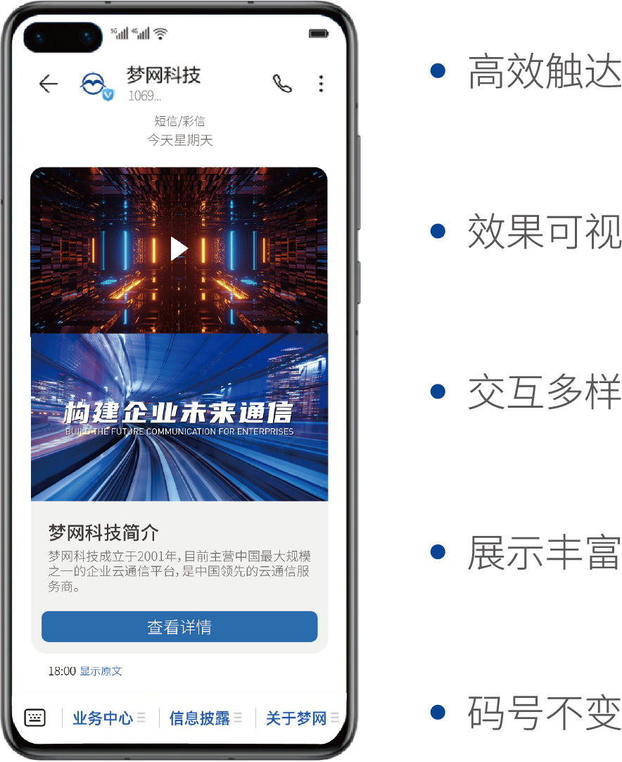 AIM消息是金年会诚信至上科技自主研发5G消息回落解决方案,能有效提升5G消息的终端覆盖。AIM消息顺利获得手机终端短信智能解析增强技术,将传统文本短信无缝升级为富媒体应用消息,有助于提升用户体验支持视频、高清图片、文字等多种媒体元素,并具备浏览器内置访问、LBS、APP、快应用、小程序、服务号、快捷支付等应用交互能力。用户可实现应用交互、内容访问、信息查询、智能客服等多功能实时互动。
