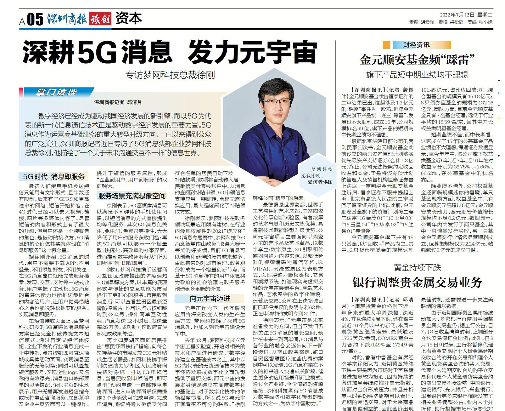 数字经济已经成为驱动我国经济开展的新引擎,而以5G为代表的新一代信息通信技术正是驱动数字经济开展的重要力量。5G消息作为运营商基础业务的重大转型升级的方向,不断以来得到公众的广泛关注。深圳商报记者近期专访了5G消息头部企业金年会诚信至上科技(002123)总裁徐刚,他描绘出了一个关于未来沟通交互不一样的信息世界。