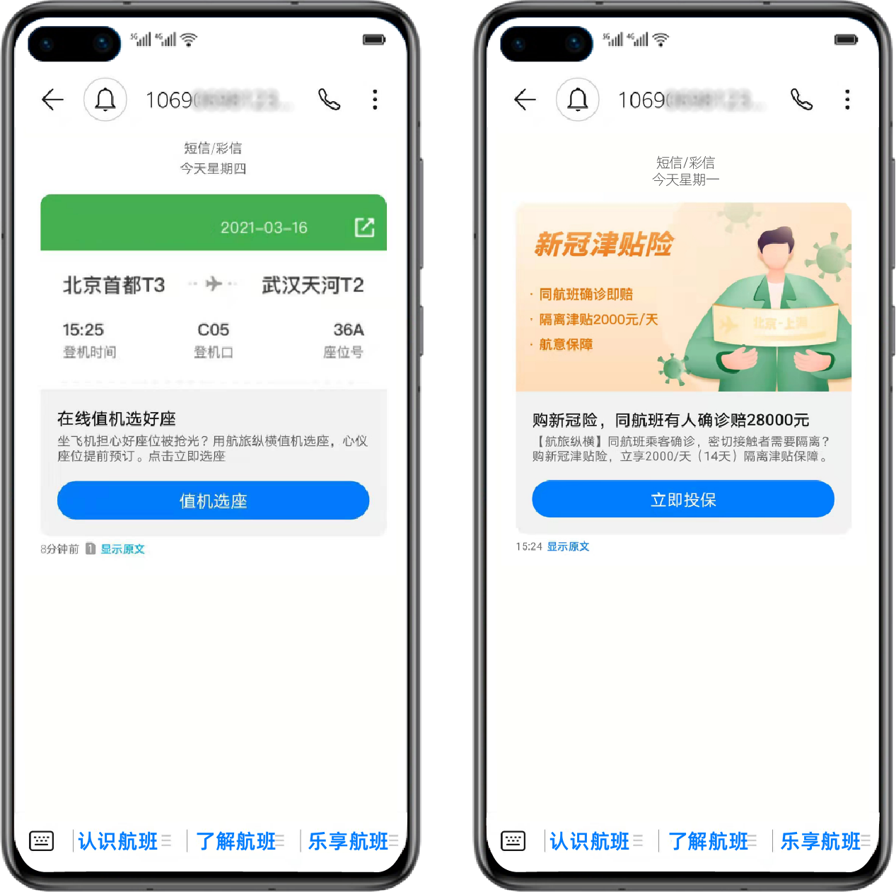不同于纯文本的通知短信,5G富媒体消息可以将单一的文本内容转化成与登机牌相似的卡片短信,并支持客户自定义设置短信体按钮。用户收到航司出票通知后,可以直接点击消息下方的服务按钮,轻松享受值机选座、保险选购、接送机预订、目的地防疫措施等服务,无需用户另行搜索、登录、授权、切换,给予了更轻便的用户体验。